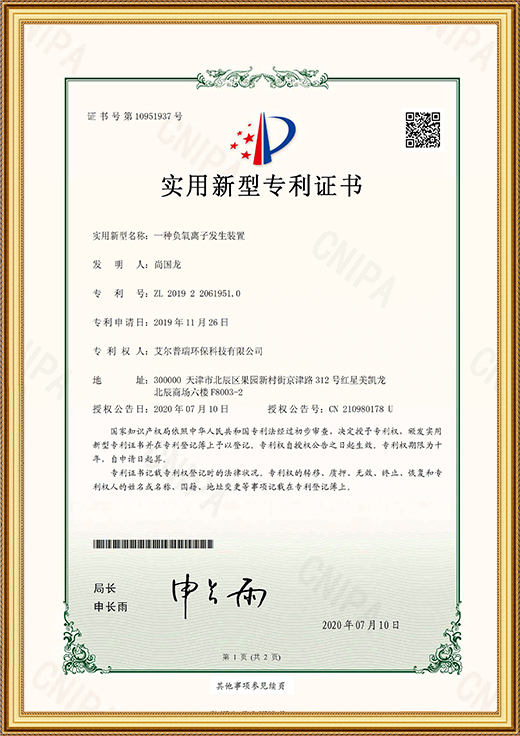 實(shí)用新型專利證書(一種負(fù)氧離子發(fā)生裝置)